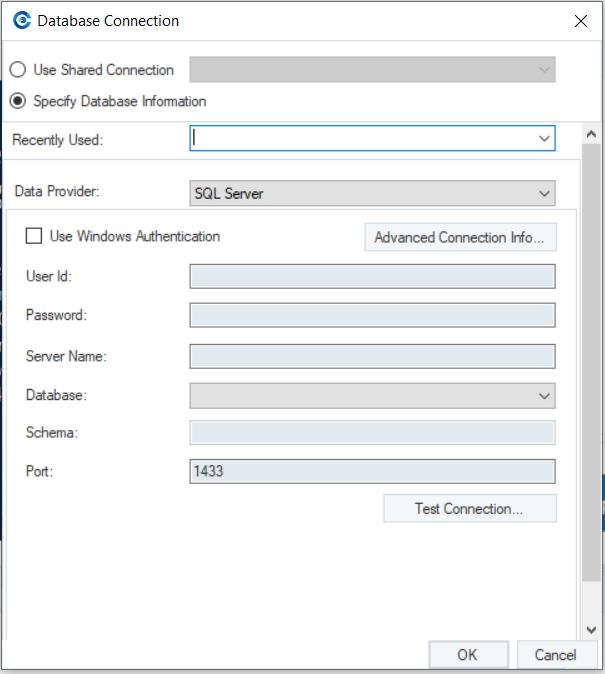 2. Select *SQL Server* from the *Data Provider* drop-down list and provide the credentials for establishing the connection.