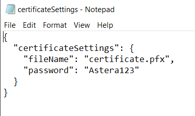 2. After you have replaced the file, open the *certificatesettings.json* file placed in the installation directory and update the new filename and password. The password will be provided to you by the SSL certificate provider.