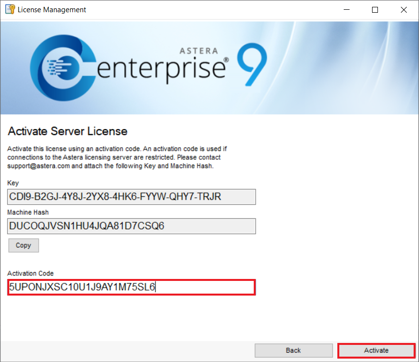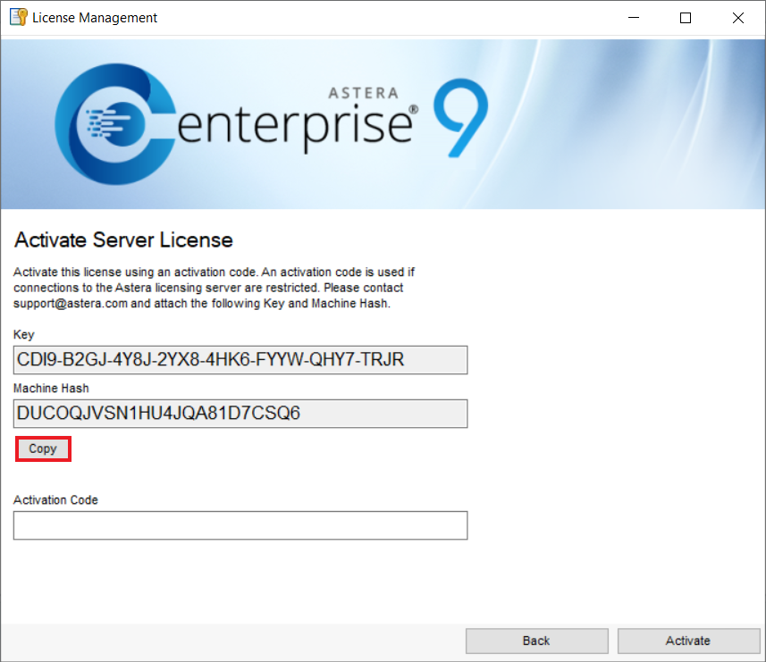 6. Now, copy the *Key* and the *Machine Hash* and email it to [support@astera.com.](mailto:support%40astera.com) The *Machine Hash* is unique for every machine. Make sure you send the correct *Key* and *Machine Hash* as it is very important for generating the correct *Activation* *Code*.