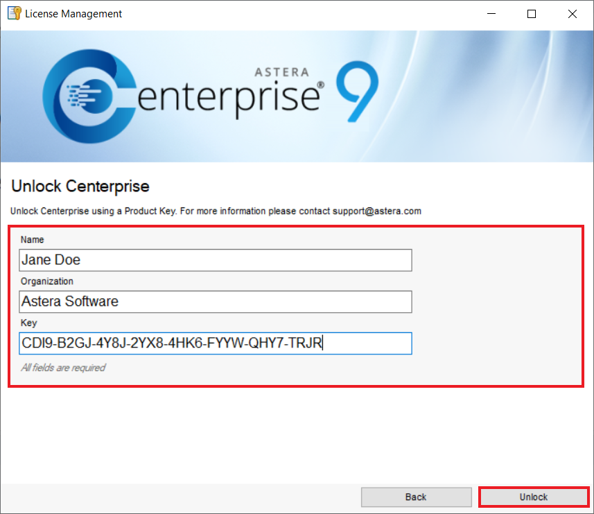 3. Type your *Name*, *Organization,* and *Key* provided to you. Then, click *Unlock*. Do the same if you are changing (instead of activating) your license offline.