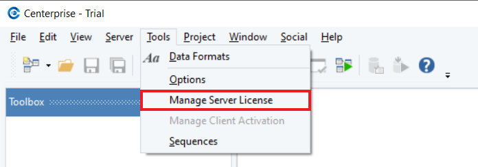 1. Go to the menu bar and click on *Tools > Manage Server License*