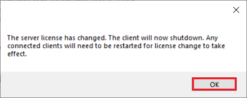 9. A pop-up window will notify you that the client needs to restart for the new license to take effect. Click *OK* and restart the client.
