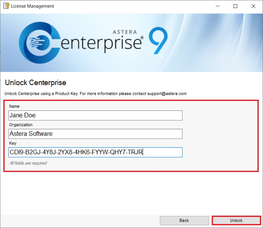 Type your Name, Organization, and Key provided to you. Then, click Unlock. Do the same if you are changing (instead of activating) your license offline.