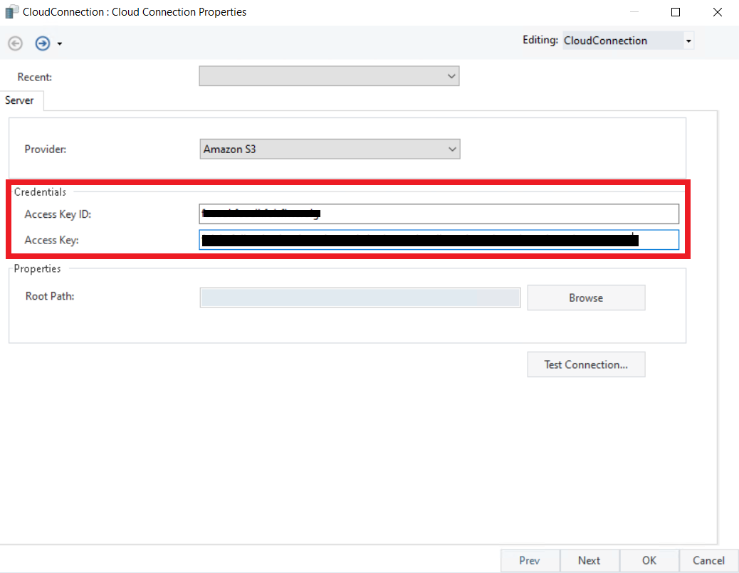 Now, provide the credentials for the Amazon S3 cloud. The credentials require: