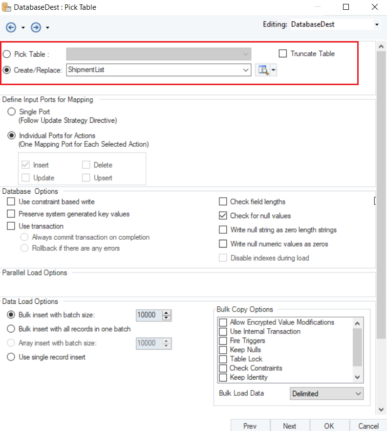 Here you can configure the properties for the Database Table Destination object.