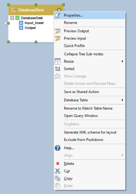 To configure the Database Table Destination object, right-click on its header and select Properties from the context menu.