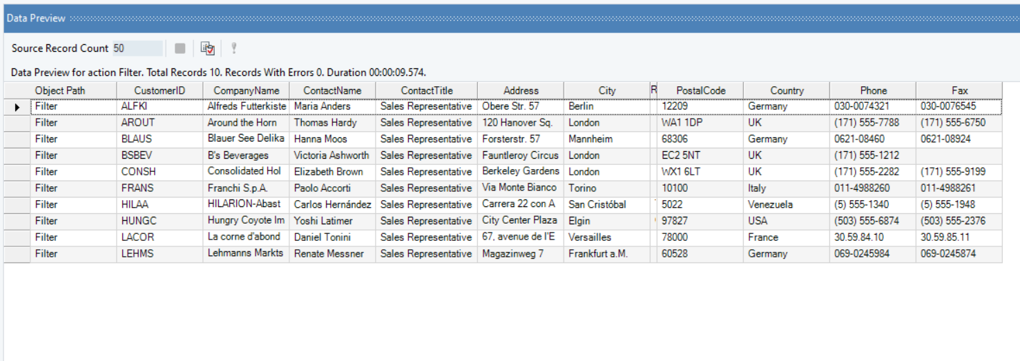 If we preview the output, we have filtered records for Customers with the contact title as Sales Representatives.