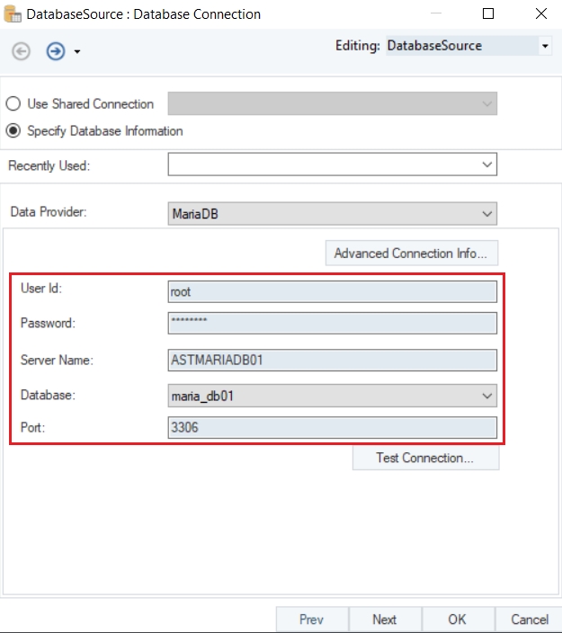 To configure the connection with MariaDB databases, we will be using the Database Table Source object.