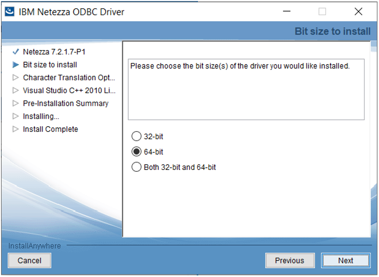 On the next screen, choose an appropriate bit size for the driver according to your target OS. Click Next.