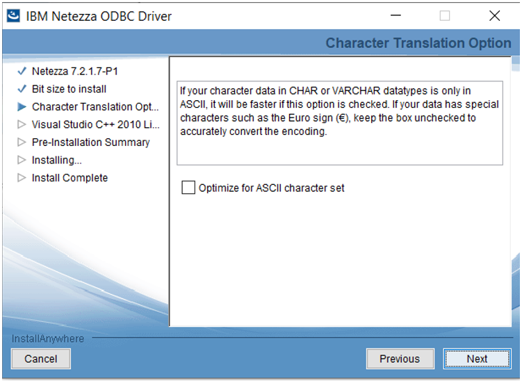 The Optimize for ASCII character set option can be selected on the Character Translation screen if you wish to convert and optimize your character data. Do not select this option if your data contains special characters. Click Next.