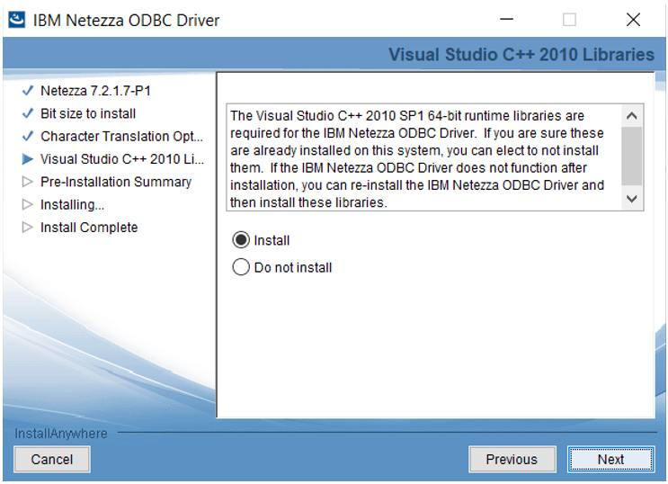 The next screen will provide the option to install C++ libraries. Select Install and click Next.