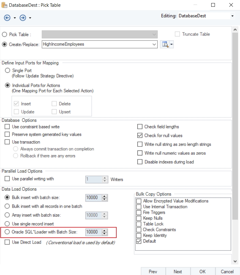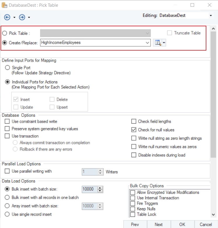 Here you can configure the properties for the Database Table Destination object.