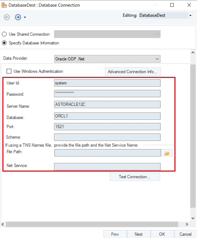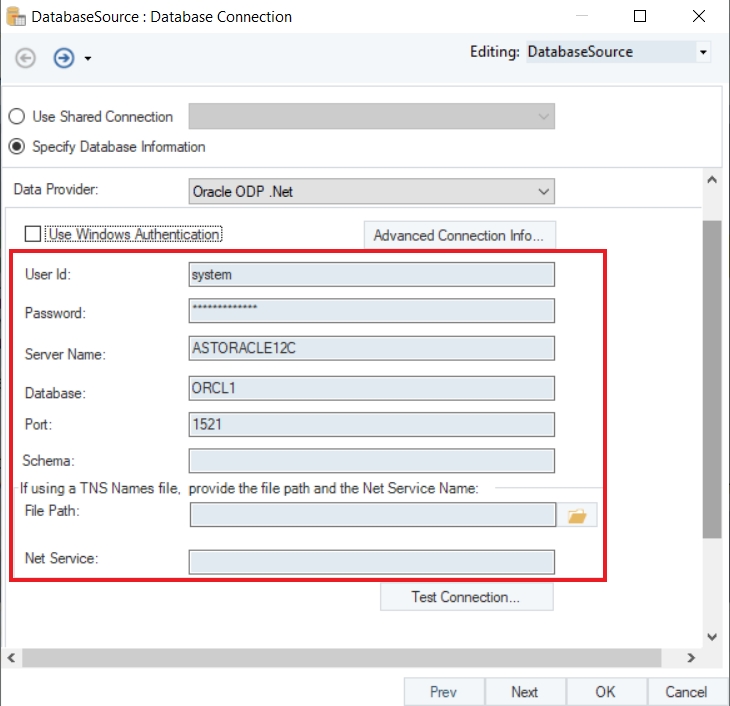 After you have entered your credentials, if you are using a TNS Names file, you will get an option to provide the File Path and the Net Service Name for this file.