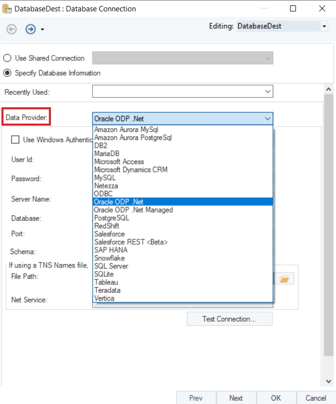 The first step is to specify the Database Connection for the destination object. Select Oracle ODP .Net as your Data Provider from the drop-down list.