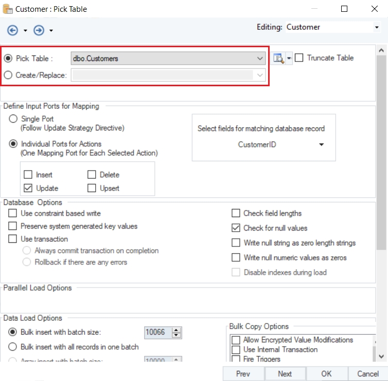 Here you can configure the properties for the Database Table Destination object.