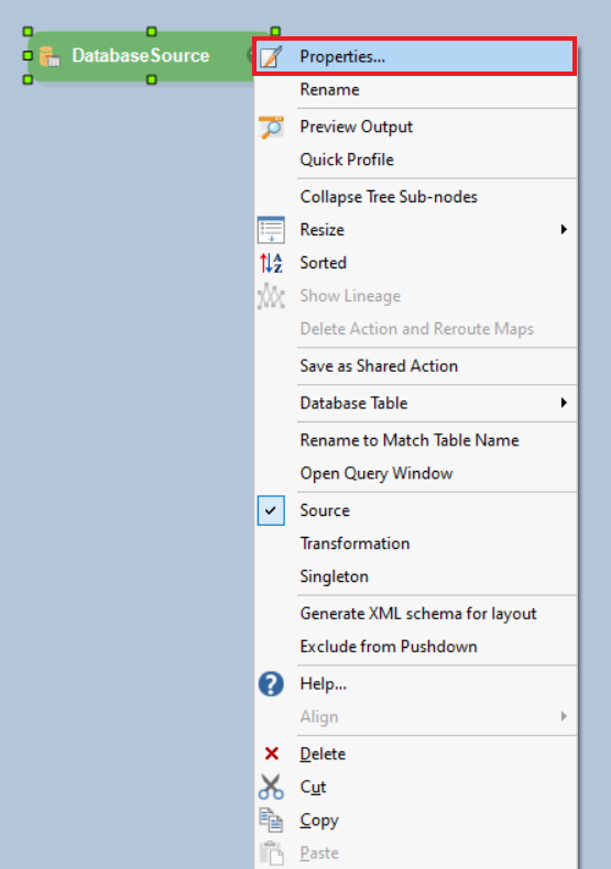 To configure the Database Table Source object, right-click on its header and select Properties from the context menu.