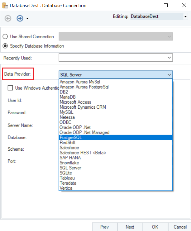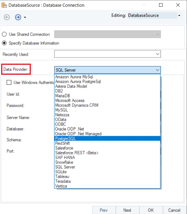 Select PostgreSQL as your Data Provider from the drop-down list.