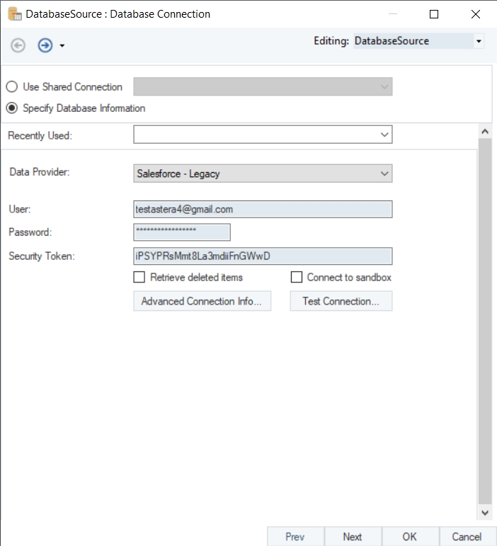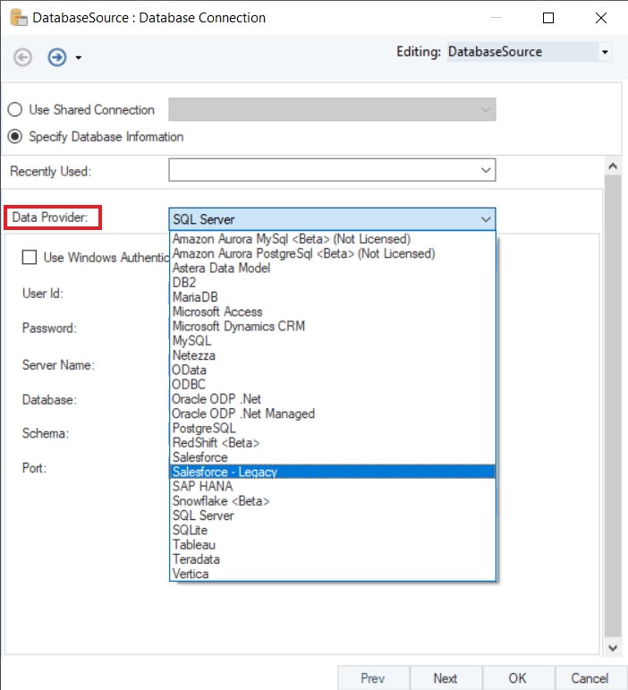On the Database Connection window, select Salesforce - Legacy from the from the Data Providers drop-down list.