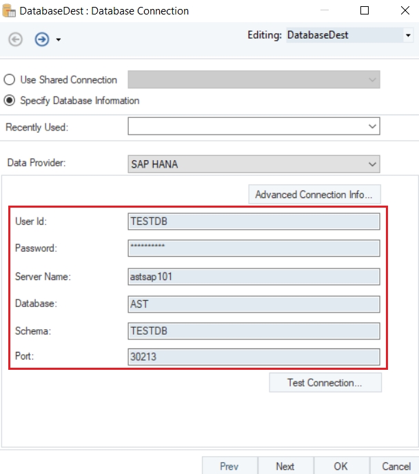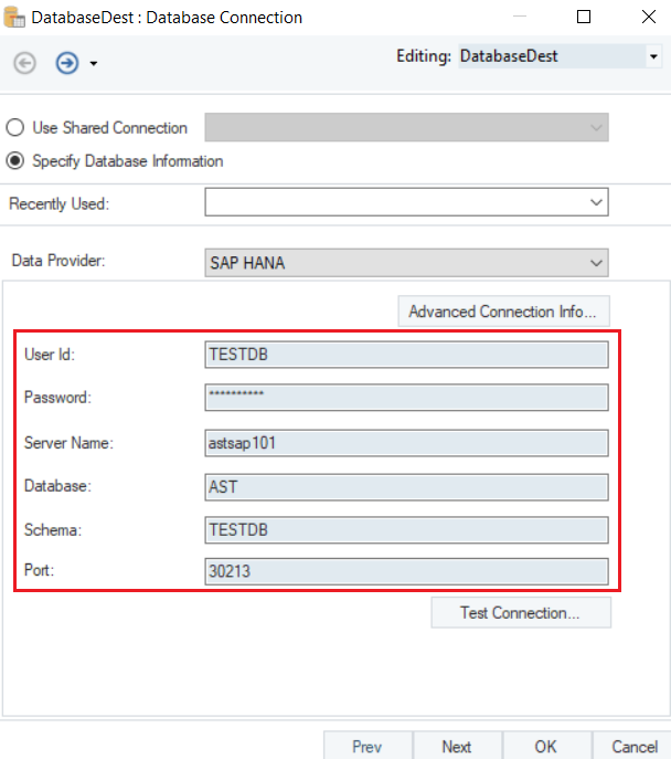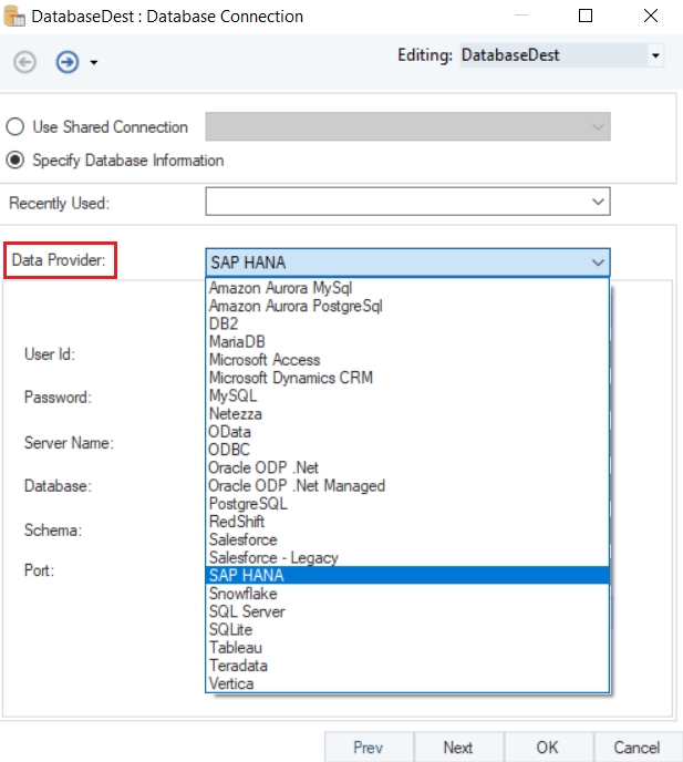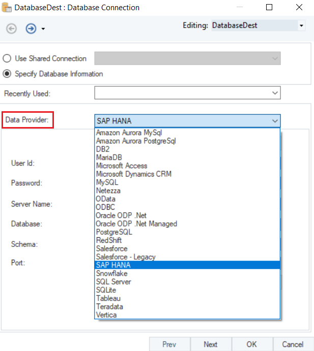Let’s connect to the SAP HANA Database using the Database Table Destination object.
