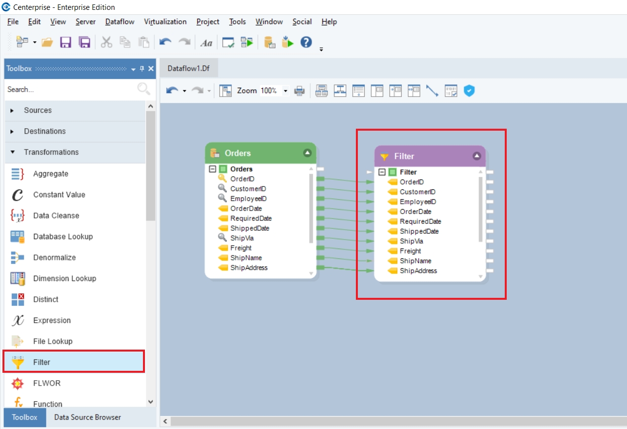 We will use the Filter transformation object to filter out records for orders to be shipped to Brazil.