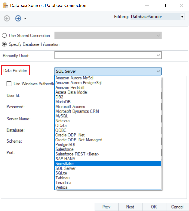 The first step is to select the Data Provider. Select Snowflake as your data provider from the drop-down list.
