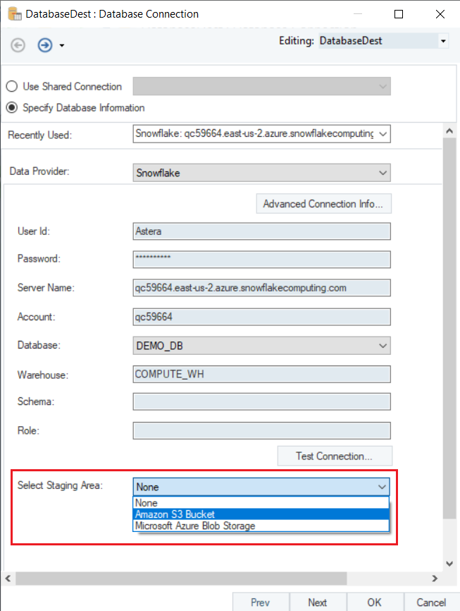 There is an option on the database connection screen for Snowflake where you can select the Staging Area.