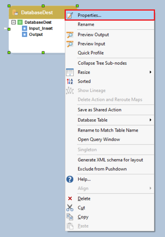 To configure the Database Table Destination object, right-click on its header and select Properties from the context menu.