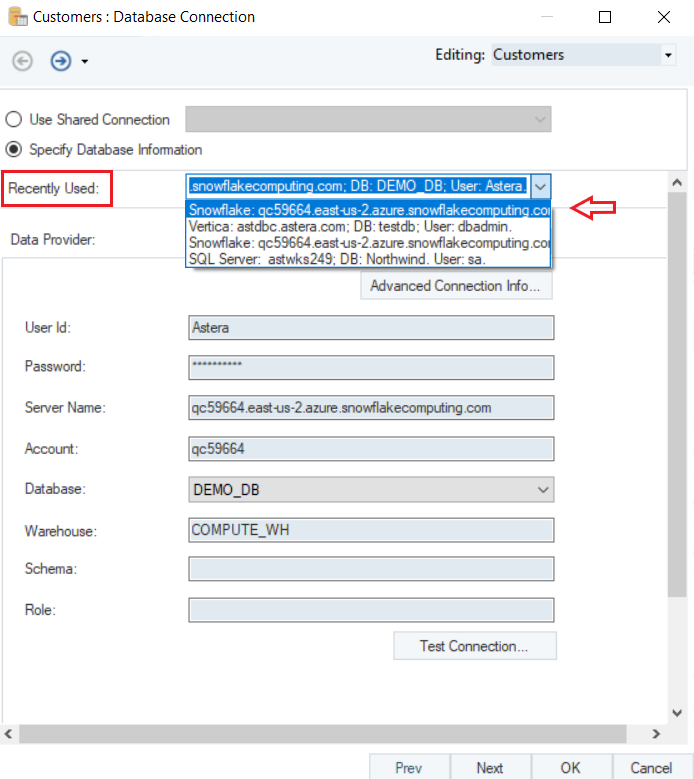 You can use the Recently Used option on the Database Connection screen to connect to the Snowflake database using the previously used credentials.