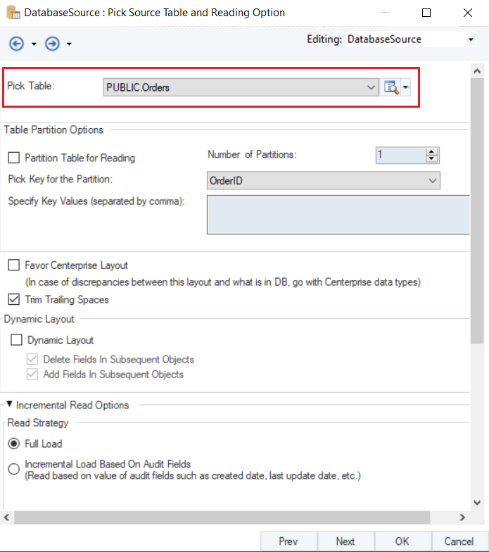 Here, you can Pick Source Table and modify Reading Options for your Snowflake database.
