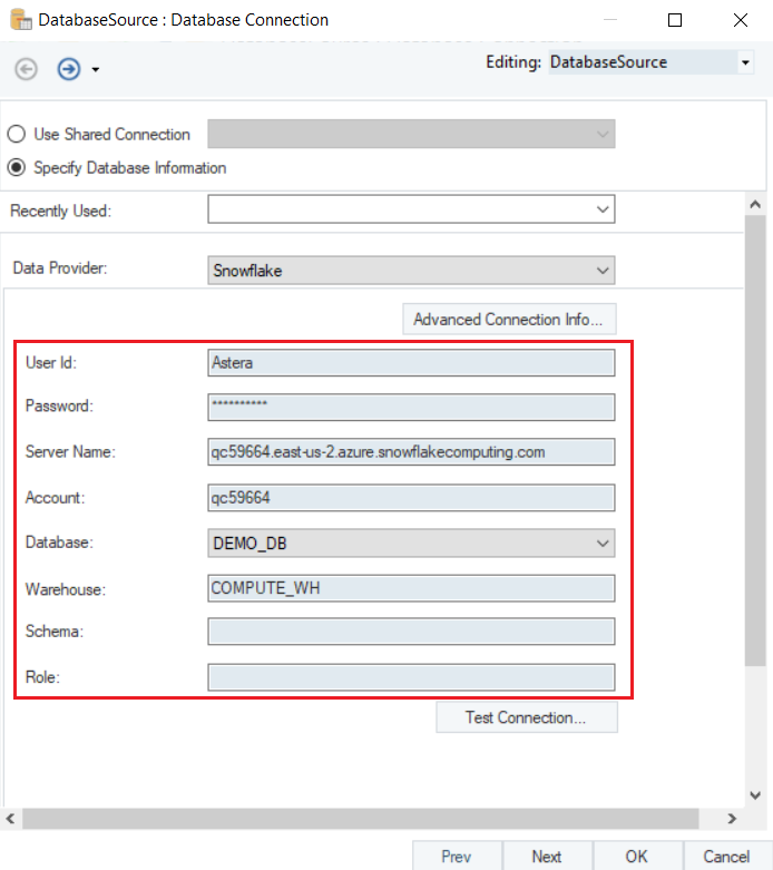 Since we have previously used Snowflake database to extract our source data, we can use the Recently Used credentials to connect to it again.
