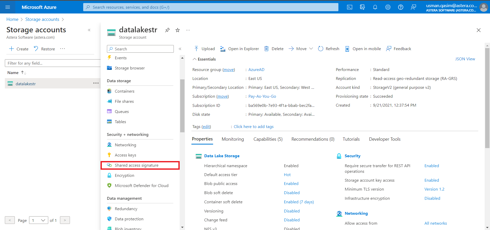 On the selected storage dashboard window, go to Security + Networking and select Shared Access Signature.