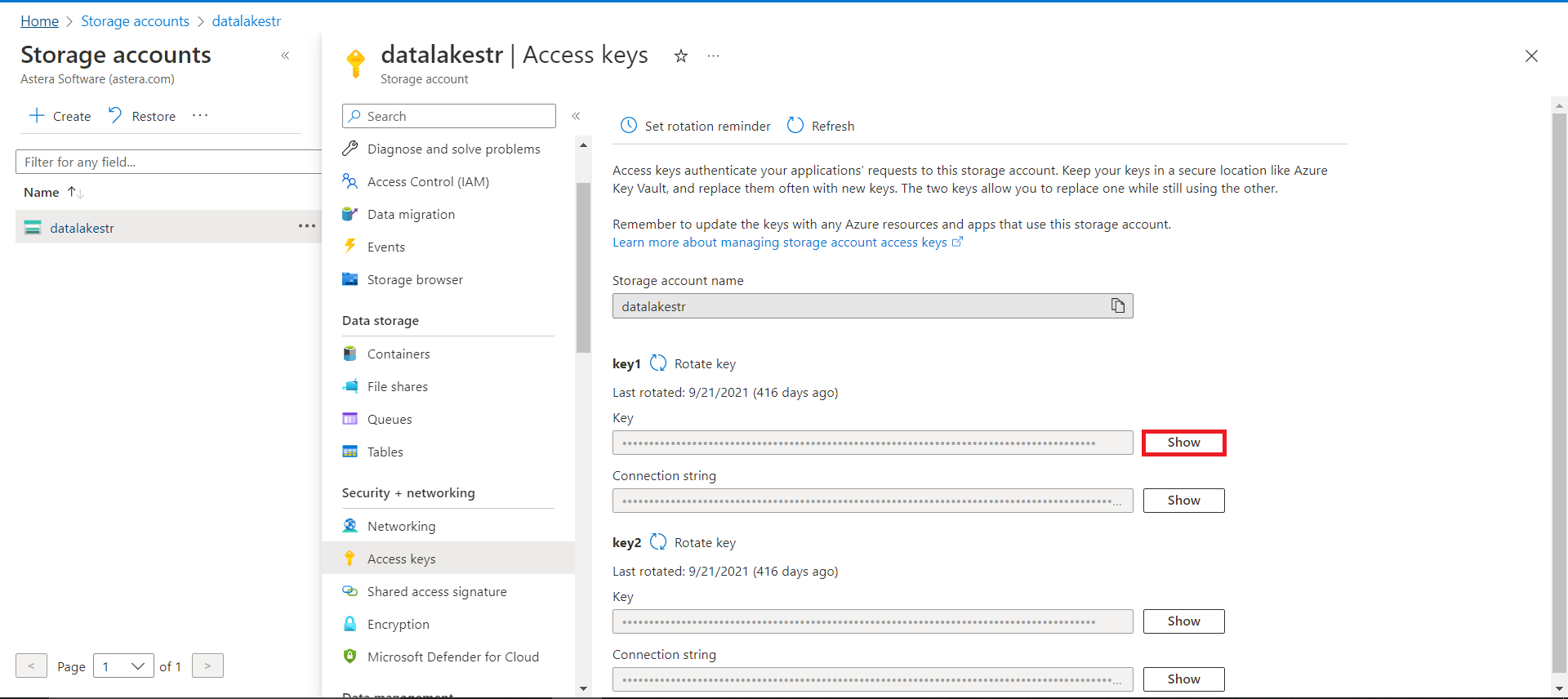 A new windowpane would open with all your access keys for the selected storage account. You need the Storage Account Name and Access Key to connect to Astera.