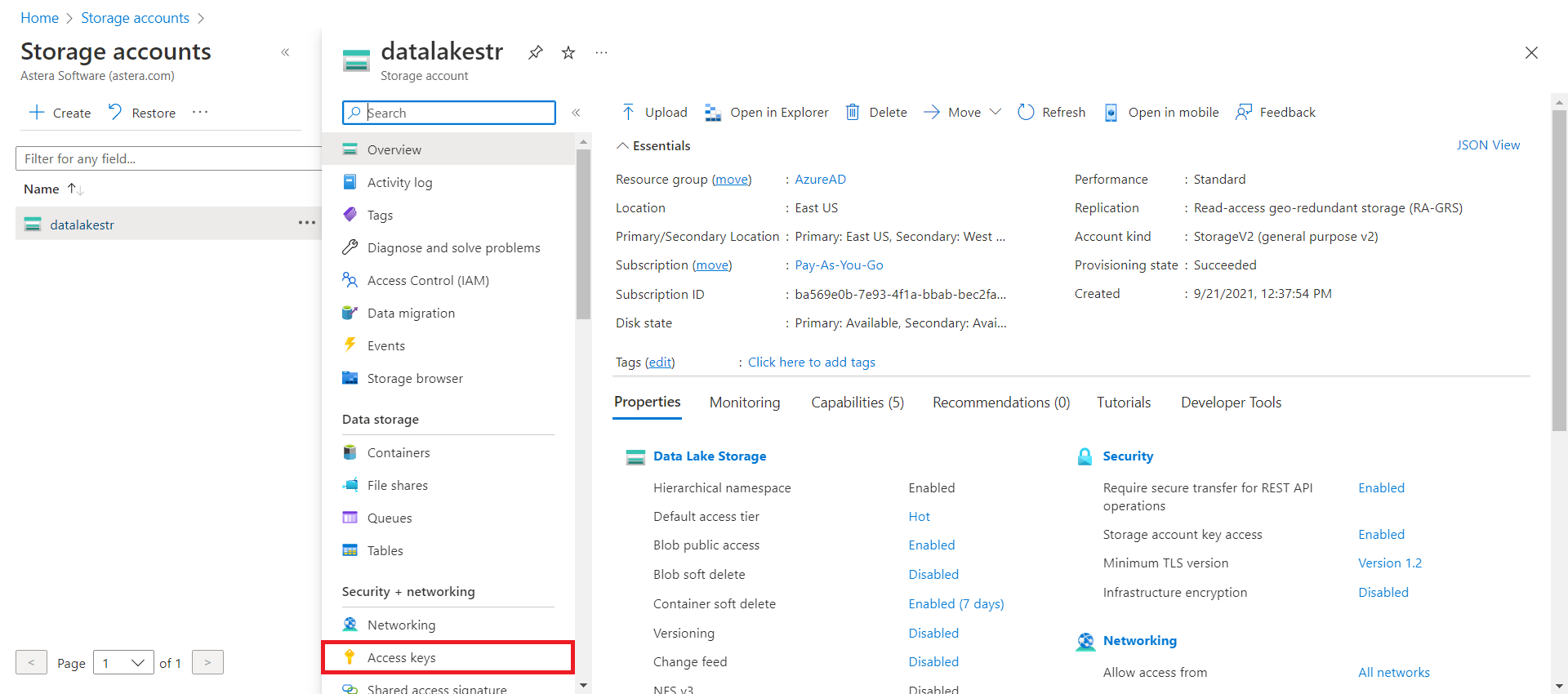 On the selected storage dashboard window, go to Security + Networking and select Access Keys.