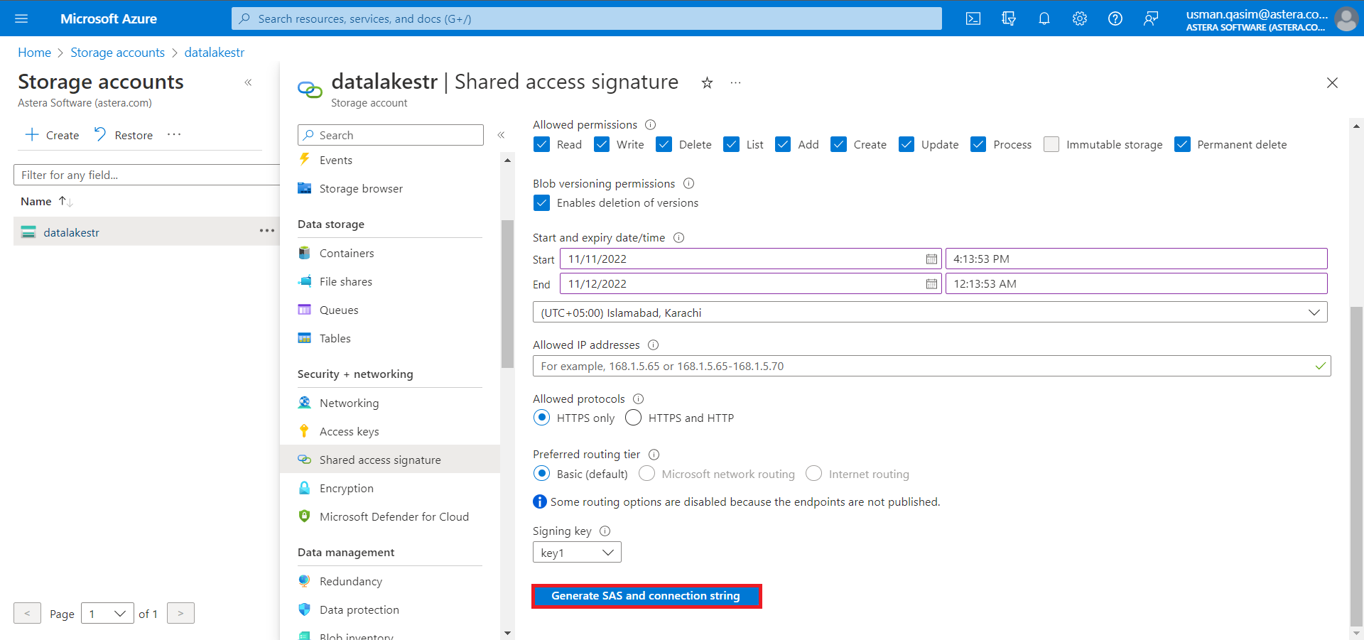 Click on Generate SAS and Connection String when you’re ready to generate the key.