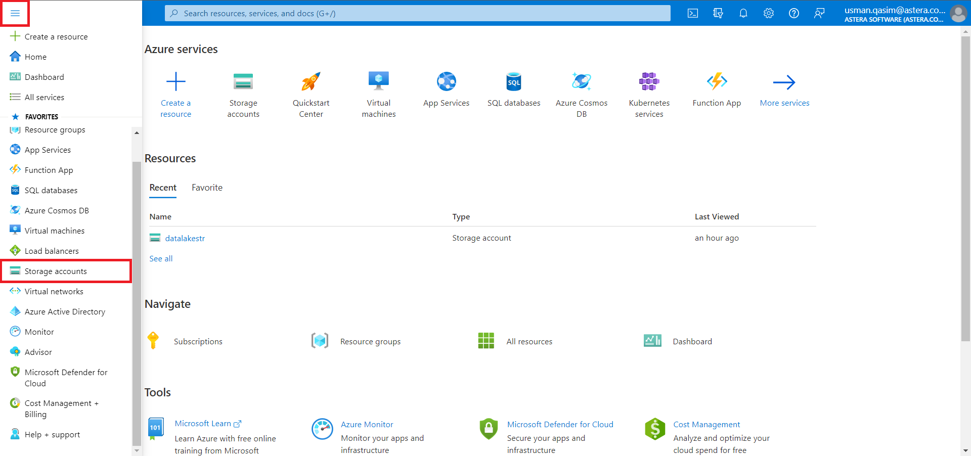 Either search for it via the search bar or go to the menu bar from the top-left corner and open storage accounts.