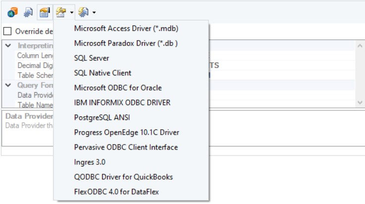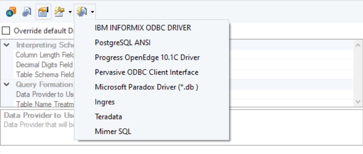 Default Driver Attributes: This is a drop-down list that has some common drivers. When a driver is selected from this list, Astera automatically sets the default attributes of this driver which can be observed in the Specify Driver Attributes panel.