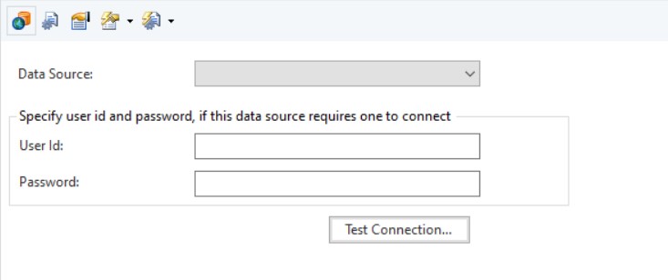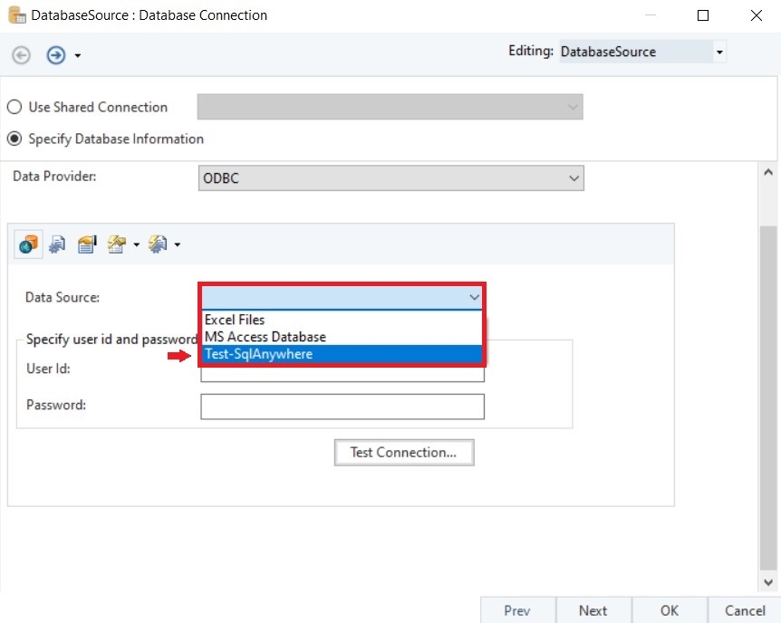From the drop-down list of Data Source, we’ll select Test-SqlAnywhere. After specifying the user ID and password, we’ll click Next.