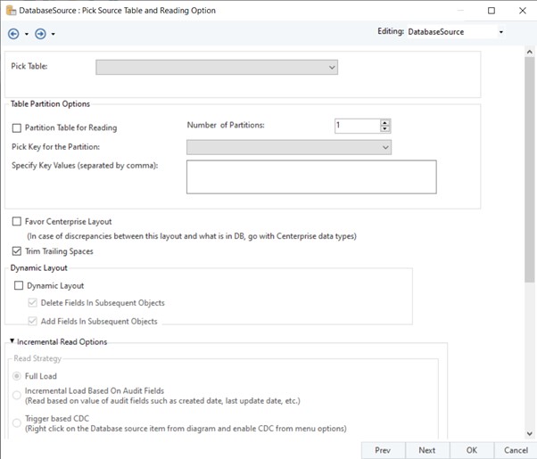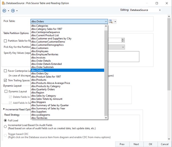 This will take us to the Pick Source Table and Reading Options window. Here we can select a table from the database and configure it from the given options.