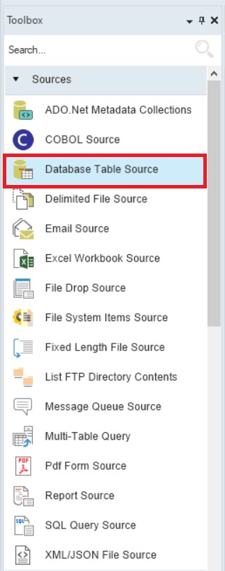 After the connection is successfully established in ODBC, we will open Astera and add the Database Table Source object to the dataflow by dragging and dropping it from the Sources section of the Toolbox.