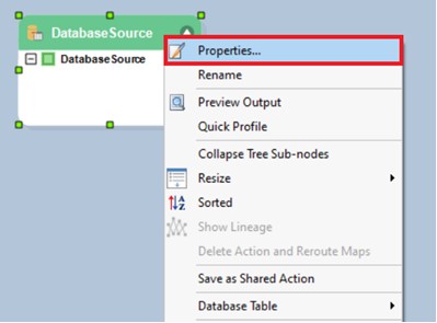 To configure the Database Table Source object, right-click on its header and select Properties from the context menu.