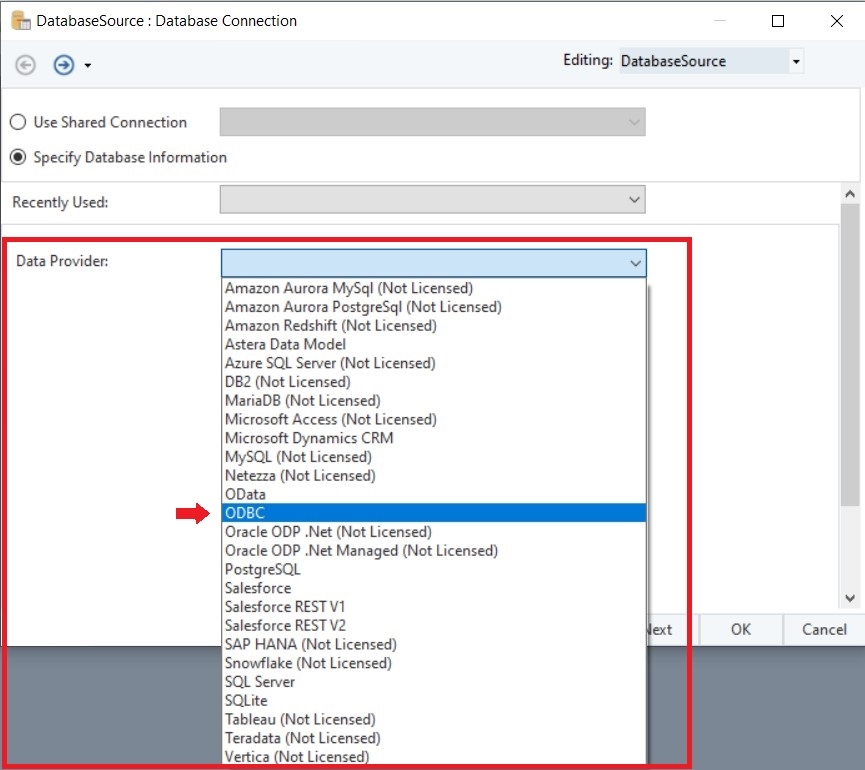 In addition to offering a wide range of database providers, Astera features an ODBC connector (Open Database Connectivity (ODBC) by Microsoft) to access data in database management systems using SQL as a standard. Thus, if you wish to connect to a data provider that does not have a native provider in Astera, ODBC can act as an intermediary between Astera and the DBMS of your choice, providing you with the ability to connect to any database that supports ODBC connection.