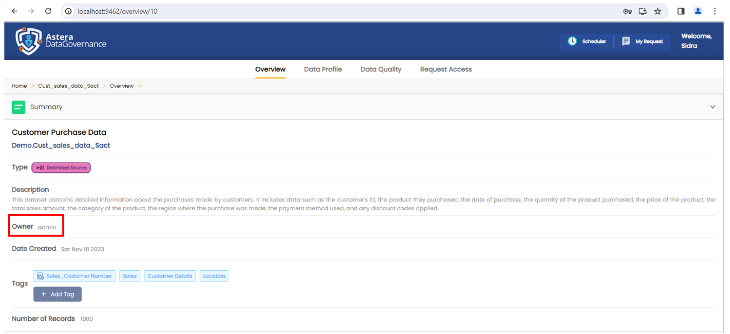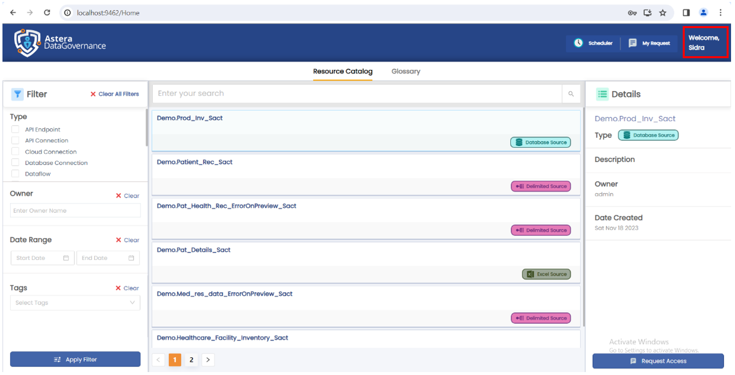 1. Log in to Astera's Data Governance platform after creating a new user. In this case, we have created the user 'Sidra'.