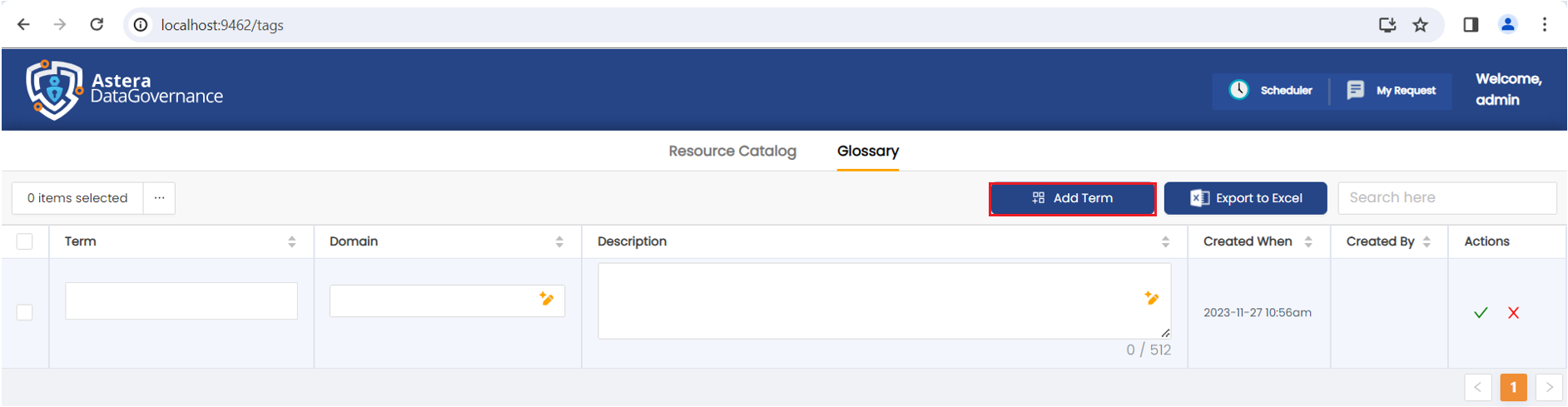2. Click on the *Add Term* option to create a new glossary term. An empty record will be added to the grid.