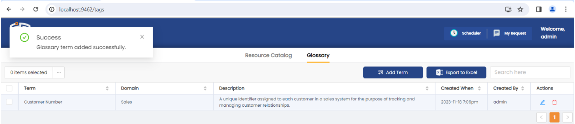 3. Provide the *Term*, *Domain* (optional), and *Description* of your desired Term and click save. The grid will now be populated with the newly created glossary term.