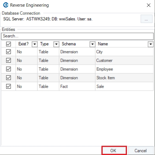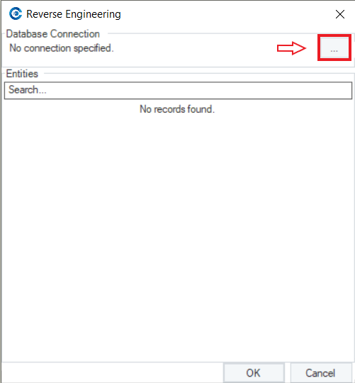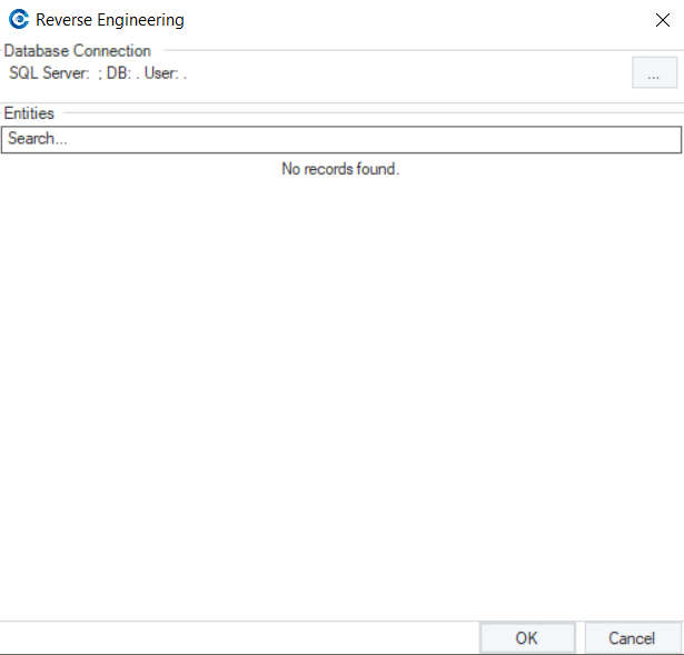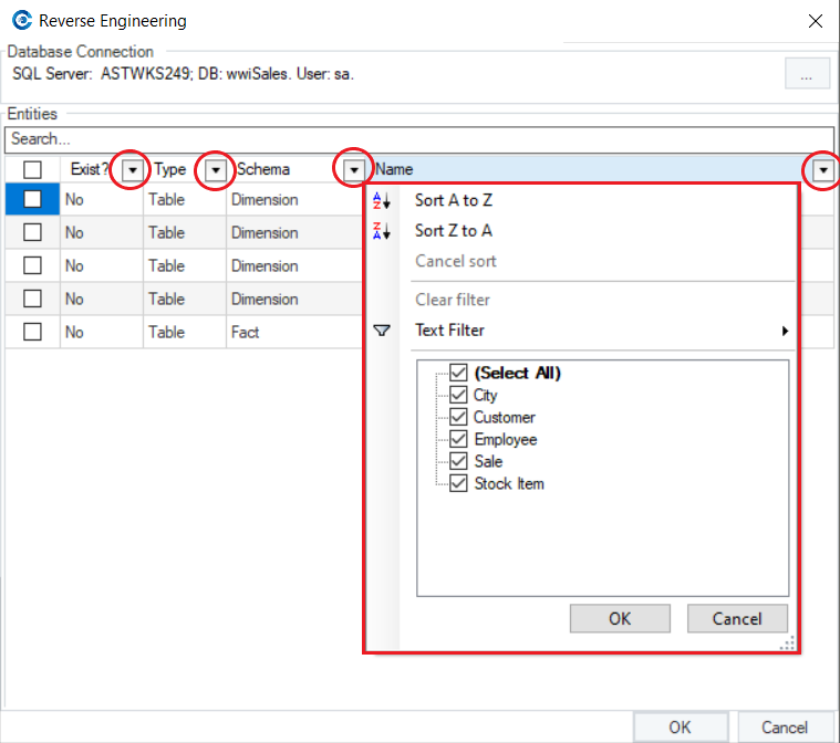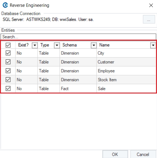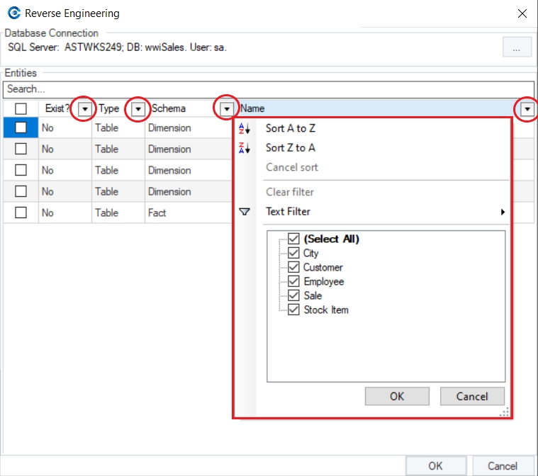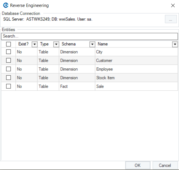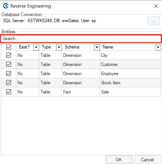 On the Reverse Engineering wizard, there is a Search option that can be used when there are numerous listed entities and specific entities are to be reverse engineered from the database.