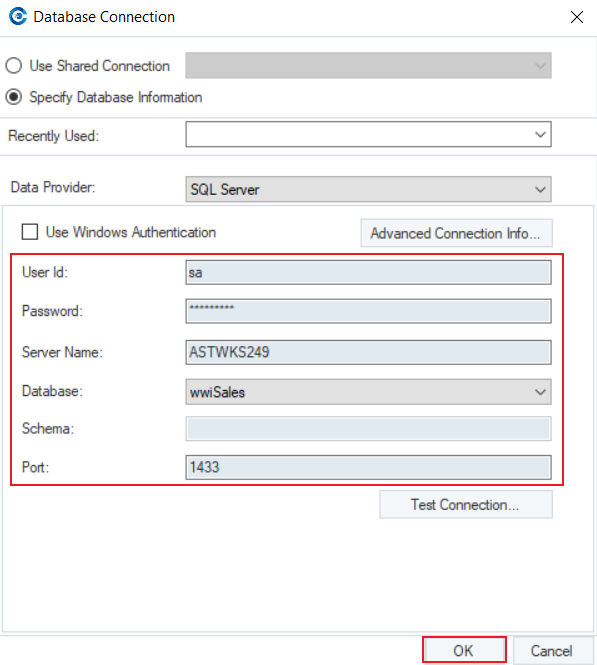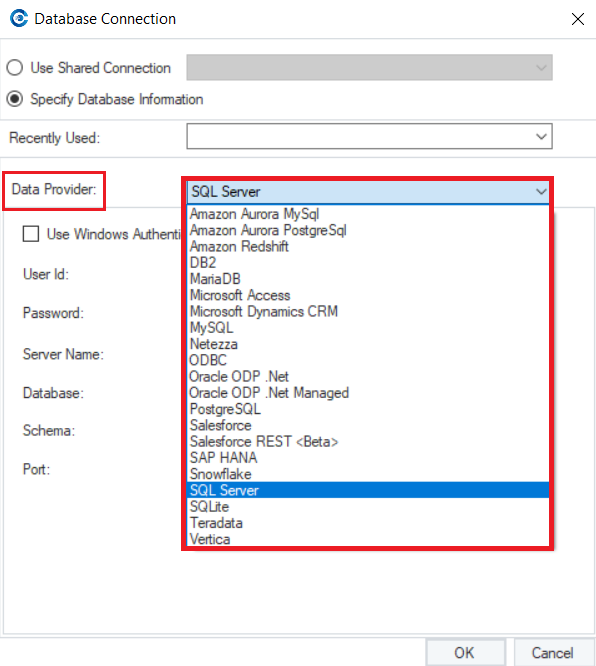 On this screen, select the data provider for the database and fill in the required credentials. Once done, click OK.