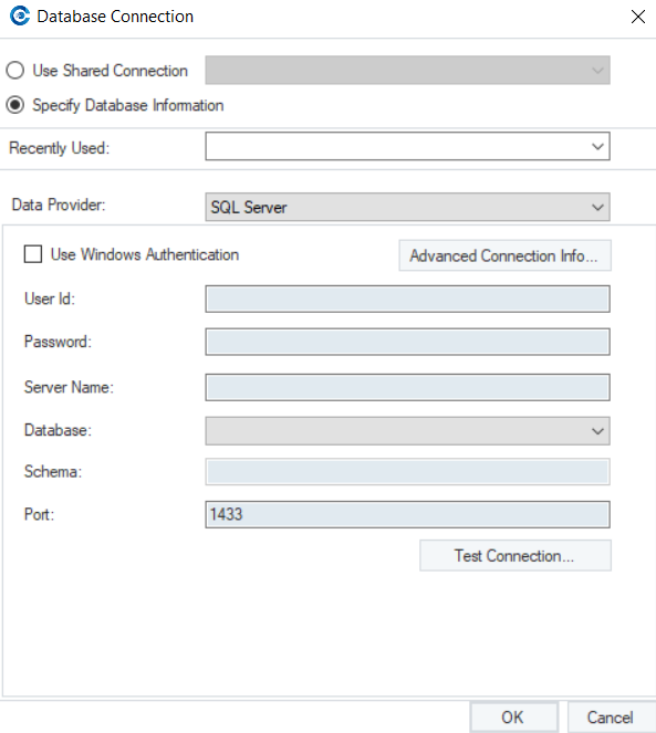 Click on the ellipses in front of the Database Connection option. A Database Connection screen will open.