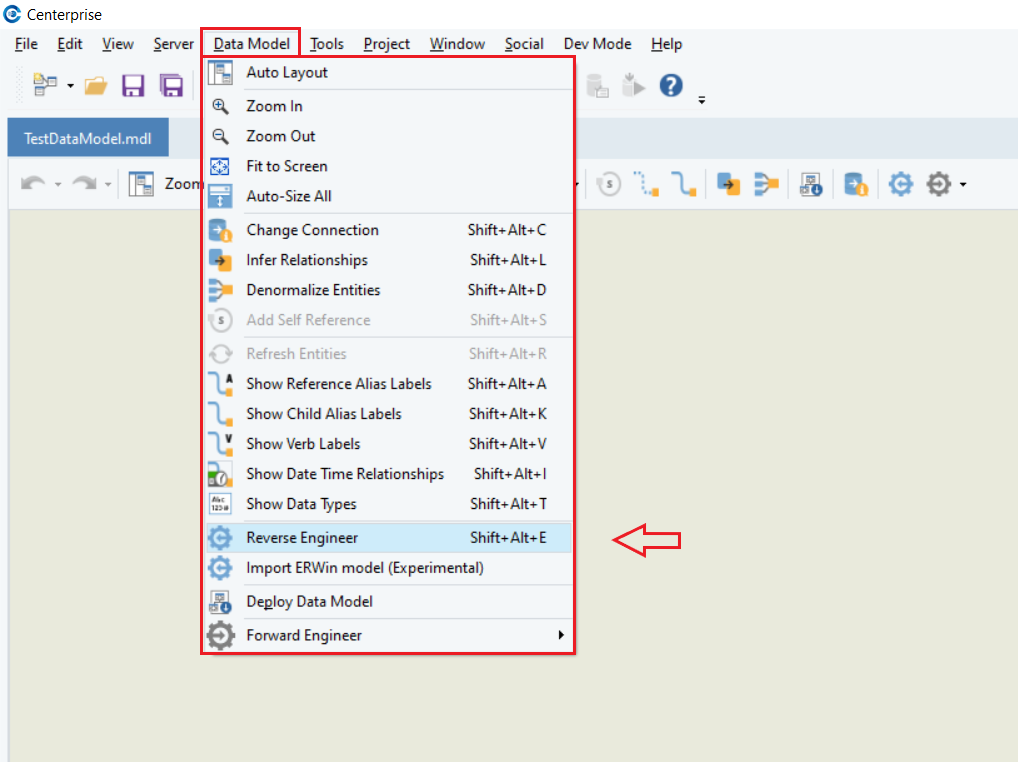 There are two ways to reverse engineer a database in Astera Data Stack. One is from the toolbar on the data model designer and the other one is from the main menu.