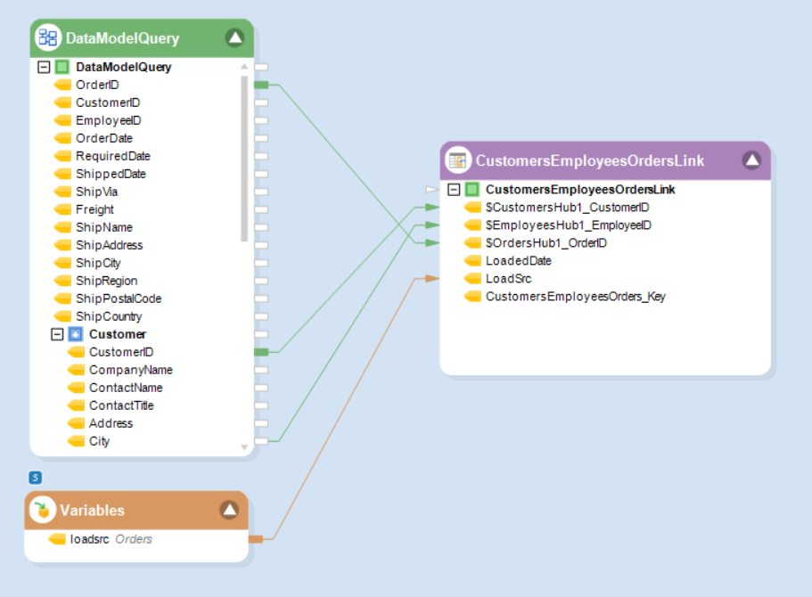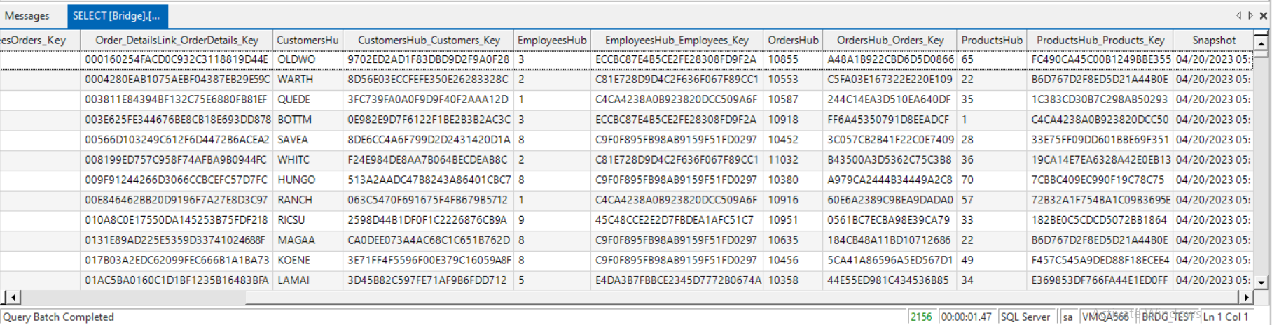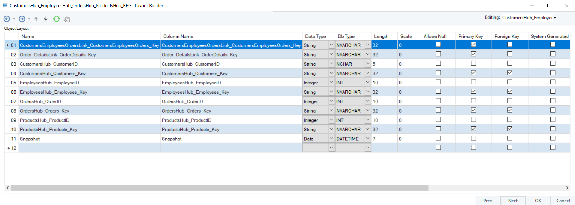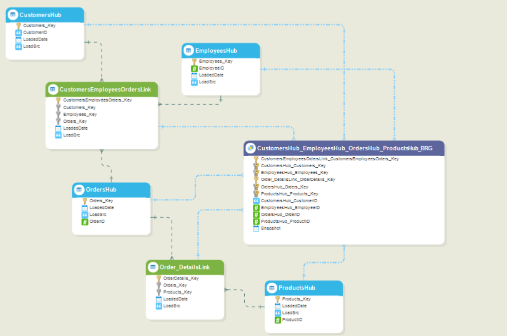 In the layout of this bridge table, you will notice a few foreign keys, such as CustomersHub_Customers_Key, OrdersHub_Orders_Key, etc. Each of these foreign keys represents a relationship between the bridge table and the related Hub. For example, the CustomersHub_Customers_Key represents the primary key of Customers Hub.