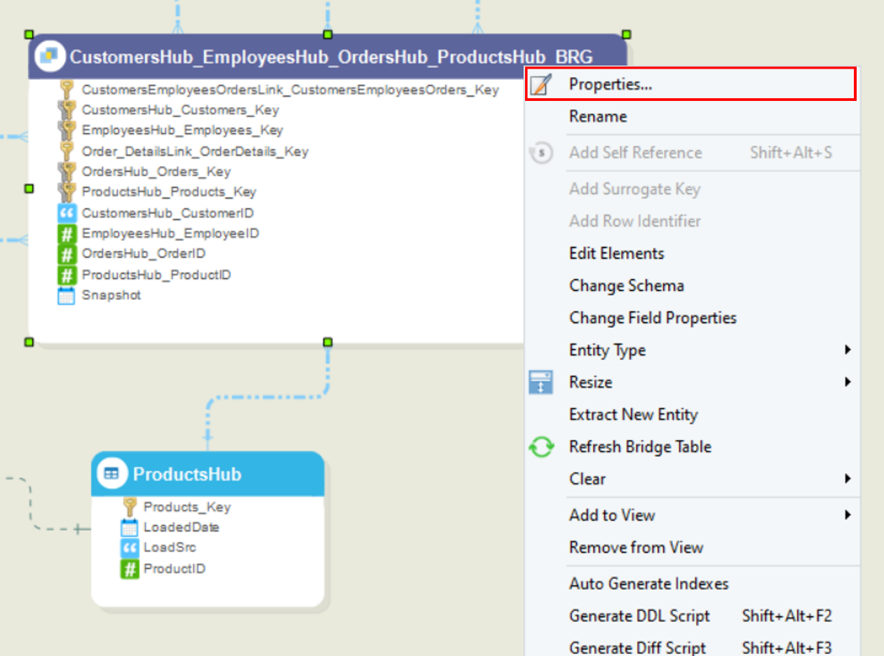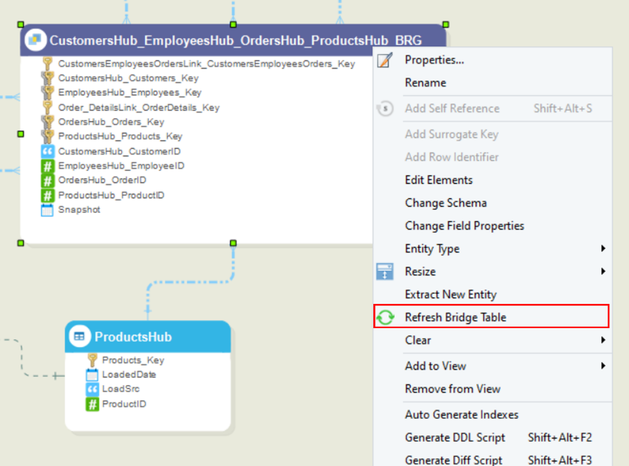 If there is a change in the properties of the Hub or Link related to the bridge table, it is necessary to refresh the layout of the bridge table before forward-engineering it to a database.